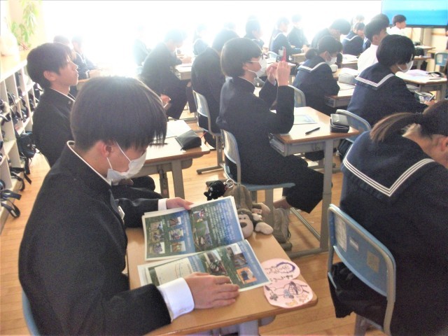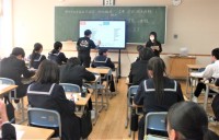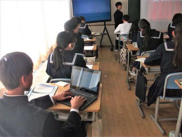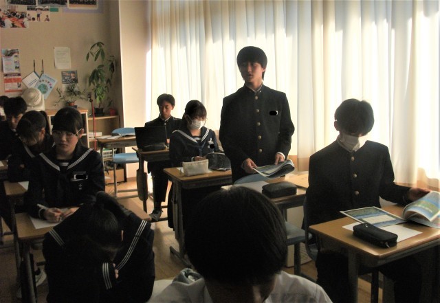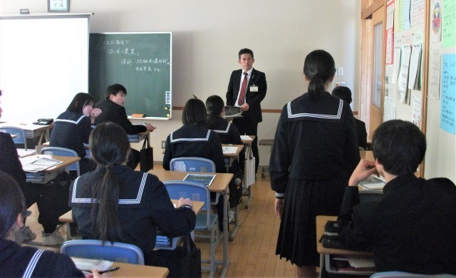 3年生の総合的な学習の時間の様子です。この学級では、農業について課題追究をしています。今日は、砺波市役所農業振興課の吉田光英さんに講師をしていただき、「砺波市の農業の発展と維持」についてお話していただきました。今年の夏の少雨・高温による渇水対策の実情やチューリップ球根栽培・玉ねぎ栽培の実態など、様々なことを教えていただきました。生徒は大変興味をもって聴き、メモをしたり、タブレット端末に記録したりしていました。