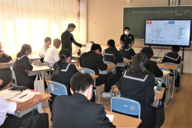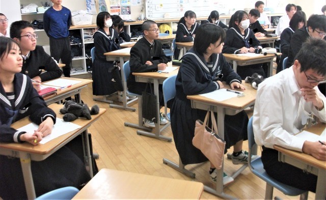 3年生の総合的な学習の時間の様子です。この学級は、砺波市社会福祉協議会の石田主事さん、濱島主事さんより、砺波市の福祉活動についてお話をしていただきました。生徒は、ワークシートにメモをしたり、気付いたことを記入したりしながら聴いていました。