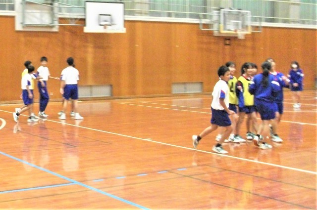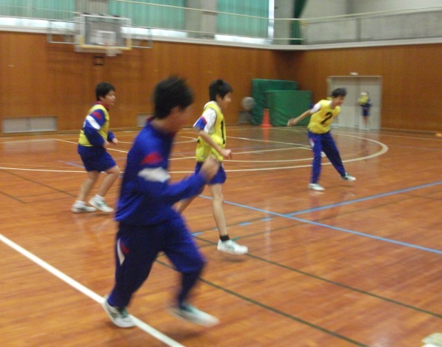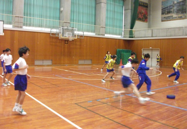 1年生の保健体育科の授業の様子です。教育実習生が指導に当たっています。外はあいにくの雨だったので、体育館でサッカーゲームに取り組んでいます。