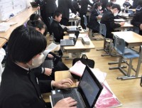 1年生の国語科の説明文の授業です。今日の課題は、「意味段落の要点スライドを見て、構成の工夫をみつけよう」です。なかなか難しい課題ですが、生徒は集中して課題を追究しています。