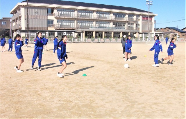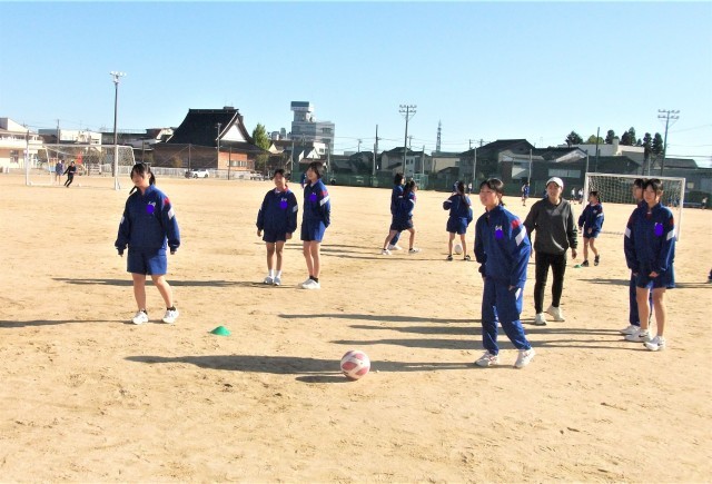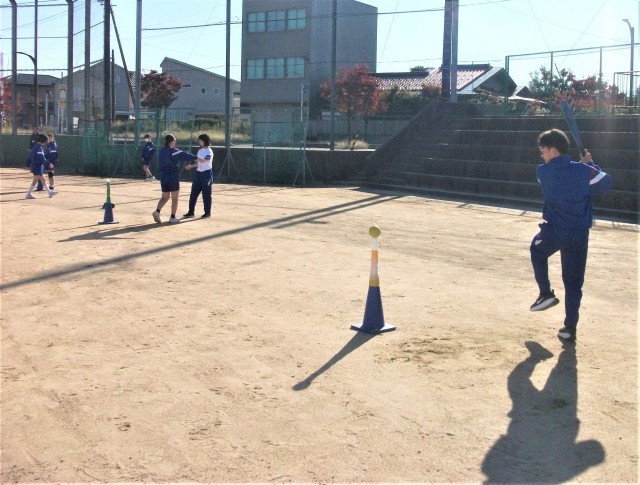2年生の保健体育科の授業の様子です。生徒は、サッカーとソフトボールに分かれて、それぞれ練習を行っていました。晴れ渡った空の下、生徒は楽しそうに練習していました。