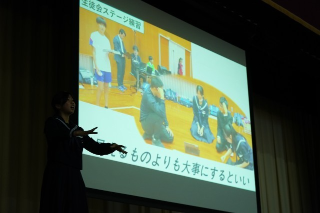 和鐘文化祭のエンディングセレモニーです。生徒が自分たちで選んだ「水平線」という曲を合唱しました。最後に本校の象徴である「和鐘」を3回鳴らして、今年の和鐘文化祭を終了しました。生徒自身の手によってつくった「生徒会ステージ」。昨日の感動的な「合唱コンクール」とともに、生徒は一段と成長しました。保護者、地域の皆様、ありがとうございました。