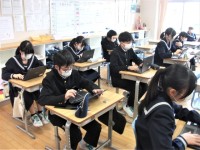 2年生の英語の授業では、英語の教科書の英文を読み、内容を読み取る活動を行いました。分からないところをペアやグループで確認し合ったり、まとめたシートを点検してもらったりなど、それぞれの方法で学びを深めていました。