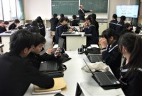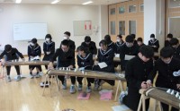 1年生の理科です。「光はガラスにぶつかったとき、どのように進むのか」を学習課題として、実験し、考察をしました。写真の場面は、真っ暗な理科室で、光の進み方の実験をしている場面です。生徒は集中して学習に取り組んでいました。