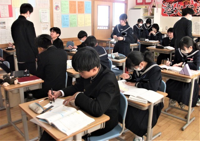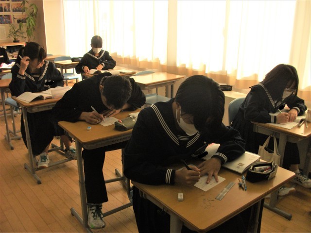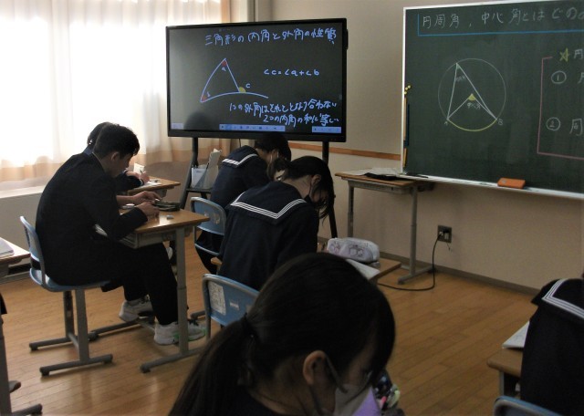 3年生の数学科です。「円周角、中心角を求めよう」という学習課題で、学習問題に取り組んでいます。個人の考えをもって、友達と相談しています。