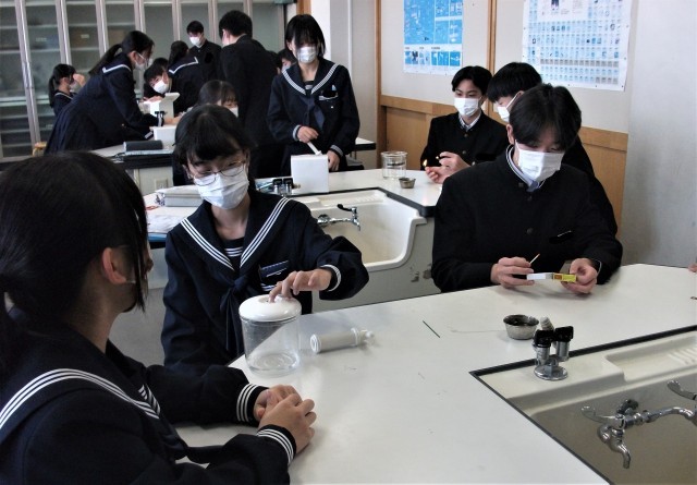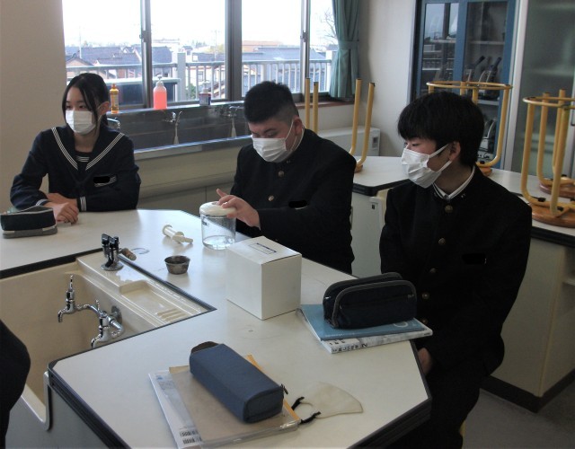2年生の理科です。「雲をつくろう」を課題として、雲を発生させる実験を行い、考察しました。雲ができる仕組みについて理解できたかな?