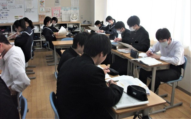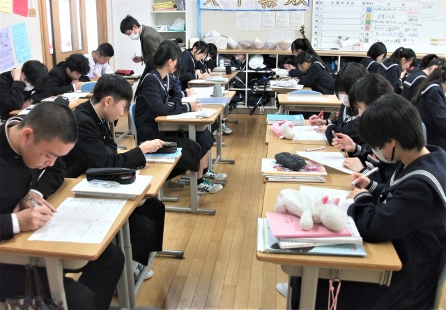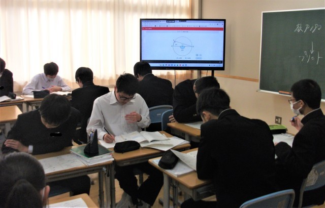 3年生の数学科です。「円周角、中心角を求めよう」を課題として、学習問題に取り組んでいます。先生に聞いたり、友達に聞いたりしながら集中して学習に取り組んでいます。