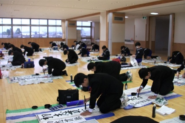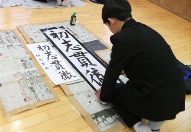 今週は、どの学年も書初め集中講座を行います。3年生の題字は「初志貫徹」。行書の字形や筆の流れを意識し、どの生徒も集中して取り組んでいます。