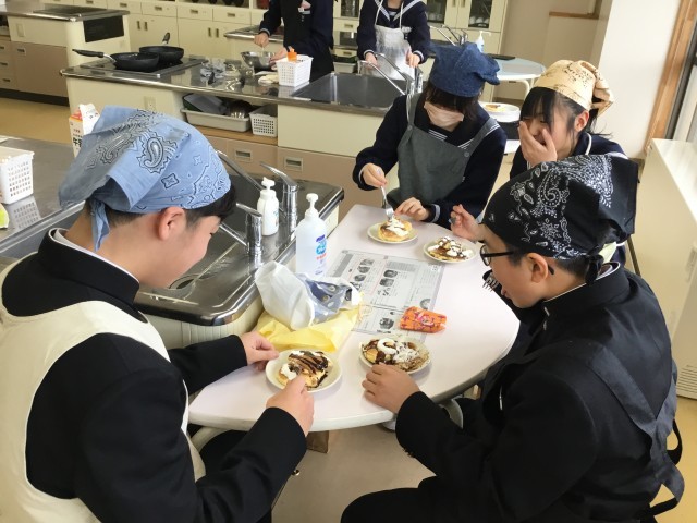 1年生では、学級の仲を深めるためにレクリエーションを企画しました。みんなで協力して、おいしいホットケーキを作りました。