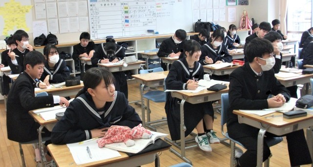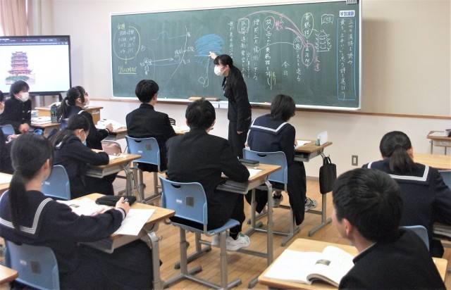 2年生の国語科です。「三つの漢詩を読み、最も『うまい!』と思う詩を選ぼう」という単元課題のもと、今日は、教科書に記載している三つの漢詩についての読み取りを行いました。