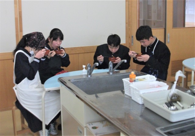 2年生の家庭科です。調理実習ですまし汁をつくりました。「隣の班にすまし汁でおもてなしをしよう」という学習課題で、他のグループのすまし汁と自分のグループのすまし汁を飲み比べています。だしの差を感じられたでしょうか。