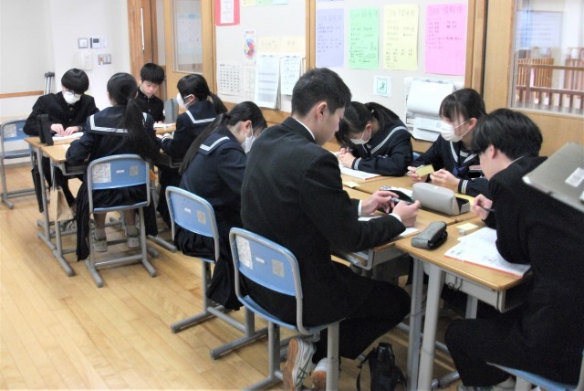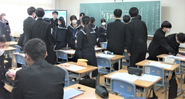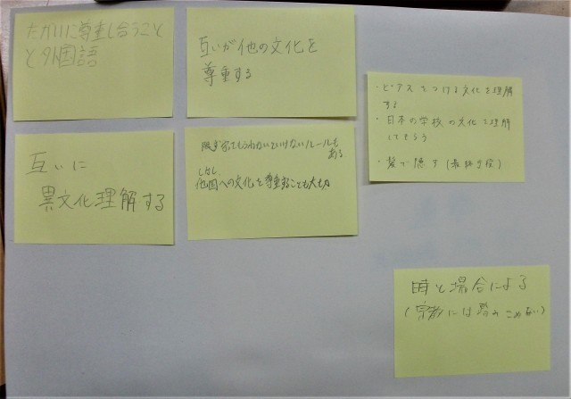 3年生の道徳科です。今日は、国際理解について考えました。異文化の転校生が大切にしていることが日本の学校の校則に適さない場合、どうすべきかについて、自分の考えを持ち、話し合いました。最後に「外国の人たちと気持ちよく過ごすために必要なことは何か」について、自分事として考えました。黄色の付箋をみると、「互いを尊重すること」という考えが多く見られました。