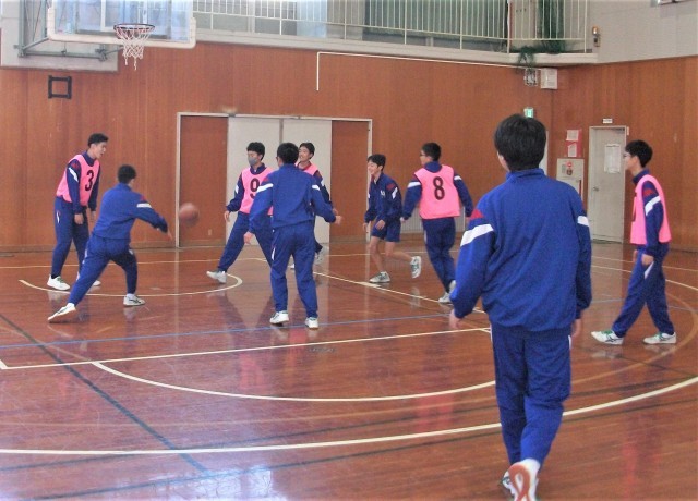 2年生の保健体育科です。バスケットボールゲームに取り組んでいます。本校の生徒はバスケが上手です。