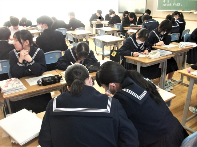 3年生の数学科の授業の様子です。教え合いながら、懸命に問題に取り組んでいます。この学級の「今年の漢字」です。