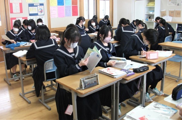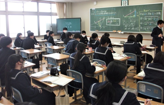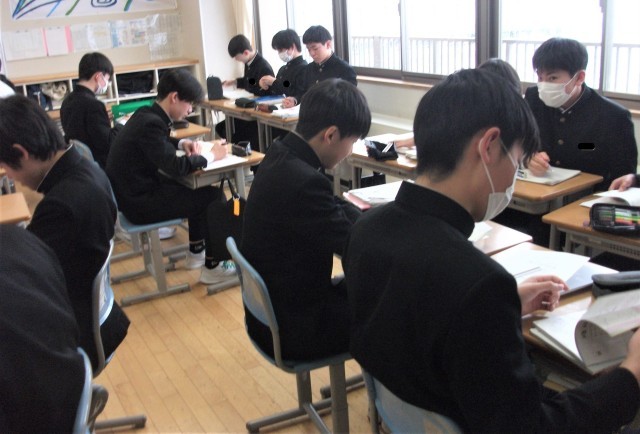 3年生の数学科です。「グラフと三平方の定理」について、学習問題に取り組みました。授業の最後は、みんなで適用問題やプリントに取り組んでいます。入試が近いので、問題を解くことが大切です。頑張れ3年生!