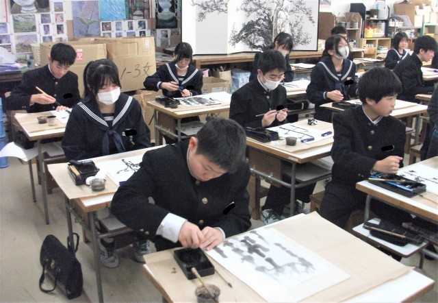 1年生の美術科です。プロの水墨画作家の先生に来ていただき、ポイントを教わりながら水墨画に挑戦しています。みんな頑張っています。