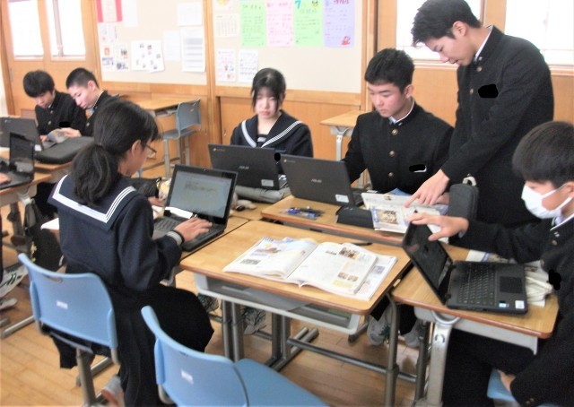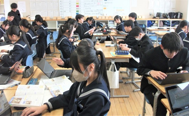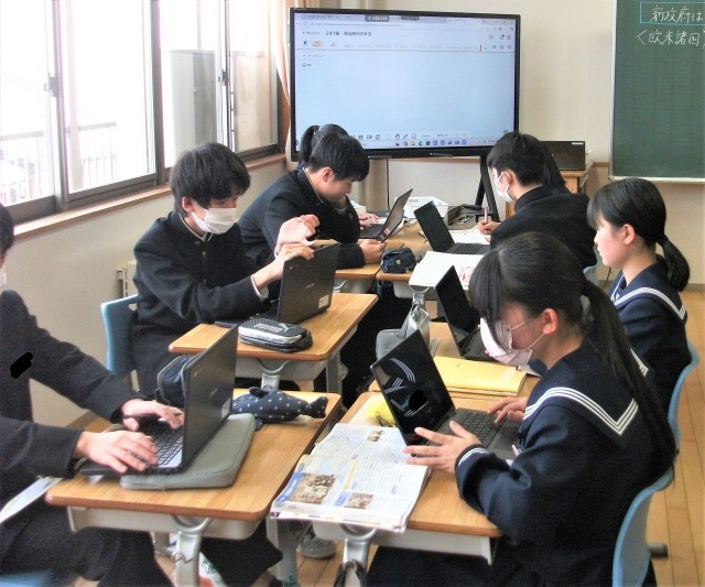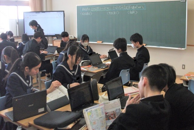2年生の社会科です。「新政府は近代国家をつくるためどんな外交政策を進めたか?」という課題で学習を進めました。生徒は資料を活用して、自分の考えをまとめました。