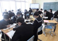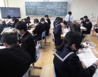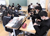 3年生の数学科です。三平方の定理の単元です。今日は、「空間図形への利用」をテーマに学習を進めました。写真の場面は、教え合いながら適用問題に取り組んでいる場面です。