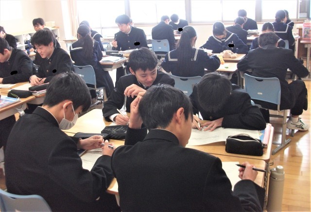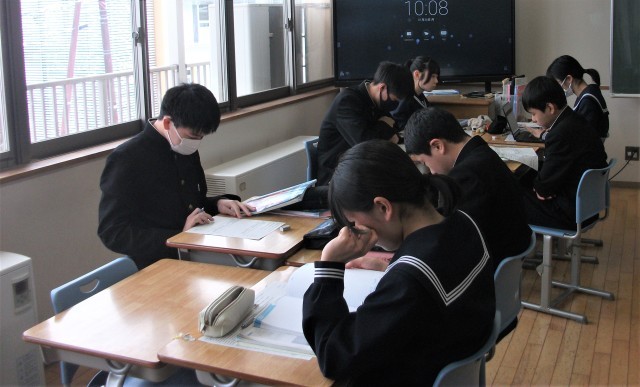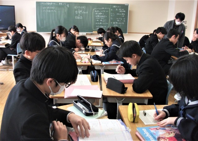 2年生の英語科です。今日の授業は、「学習の振り返り」です。黒板には、復習を行う上でのポイントが示されています。生徒は、示されたポイントを参考にして、教え合いながら学習を進めています。