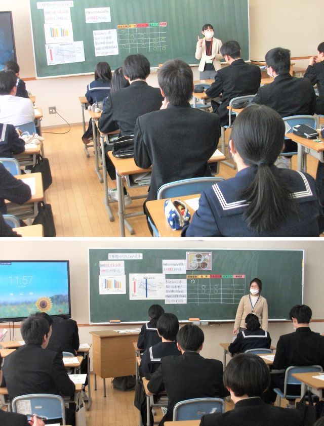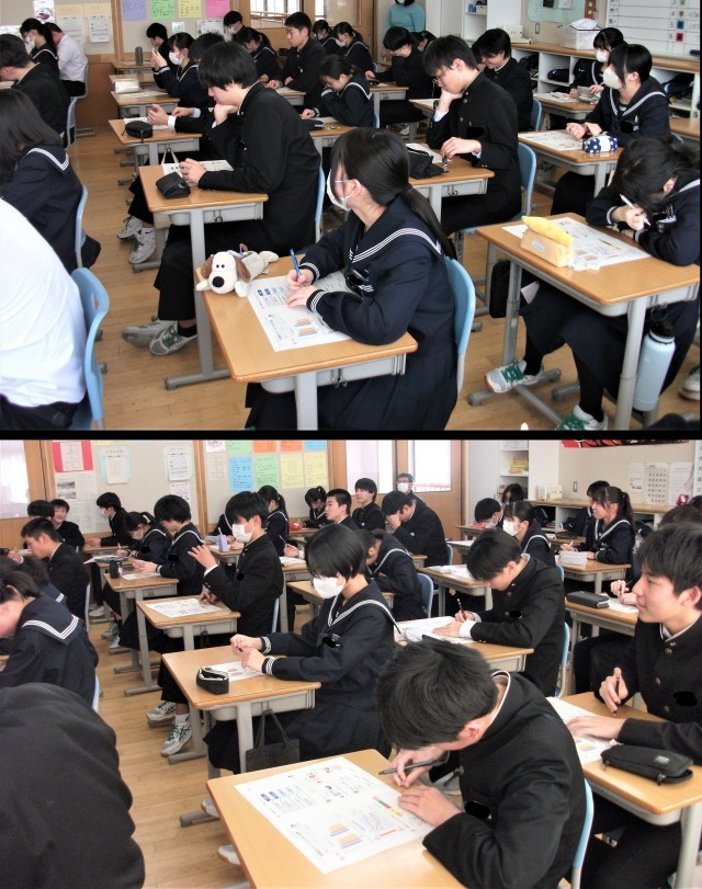 今日から、3年生の全学級で、砺波市学校給食センターの栄養教諭による「受験期をのりきるための食事は?」という特別授業を行っています。今日は、2学級で行われました。受験期をのりきるための食事の取り方について分かったかな?頑張れ3年生!