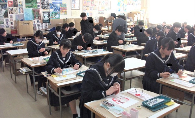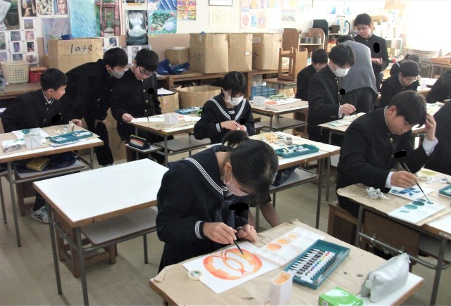 1年生の美術科です。自然物の平面構成の学習をしています。生徒は色彩を工夫して着色しています。完成に近づいています。