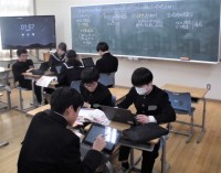 1年生の数学科です。「おうぎ形の中心角の大きさを求めよう」という課題で学習を進めています。写真は、課題についての自分の考えを伝え合っている場面です。