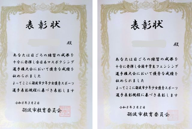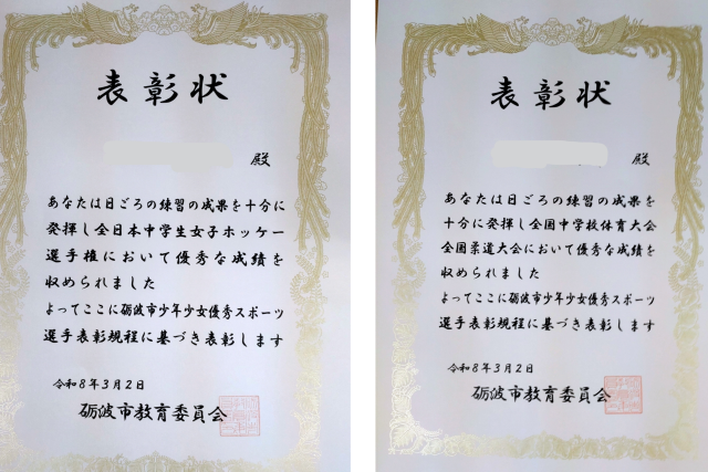 受賞報告 砺波市少年少女優秀スポーツ選手表彰式より  3/2