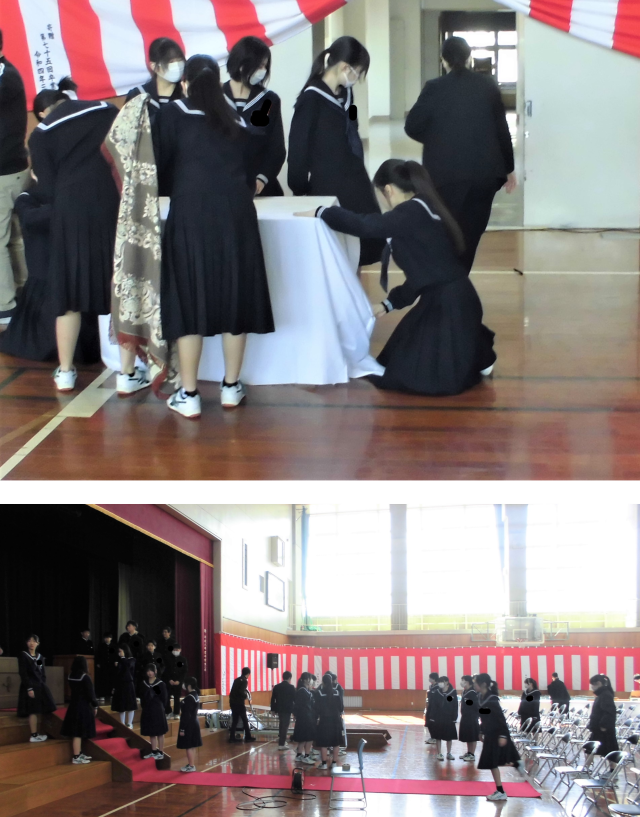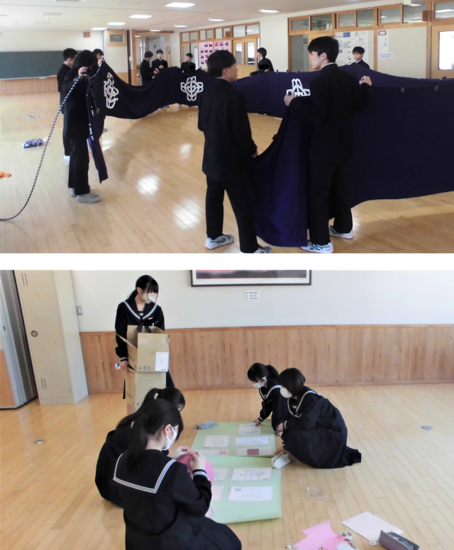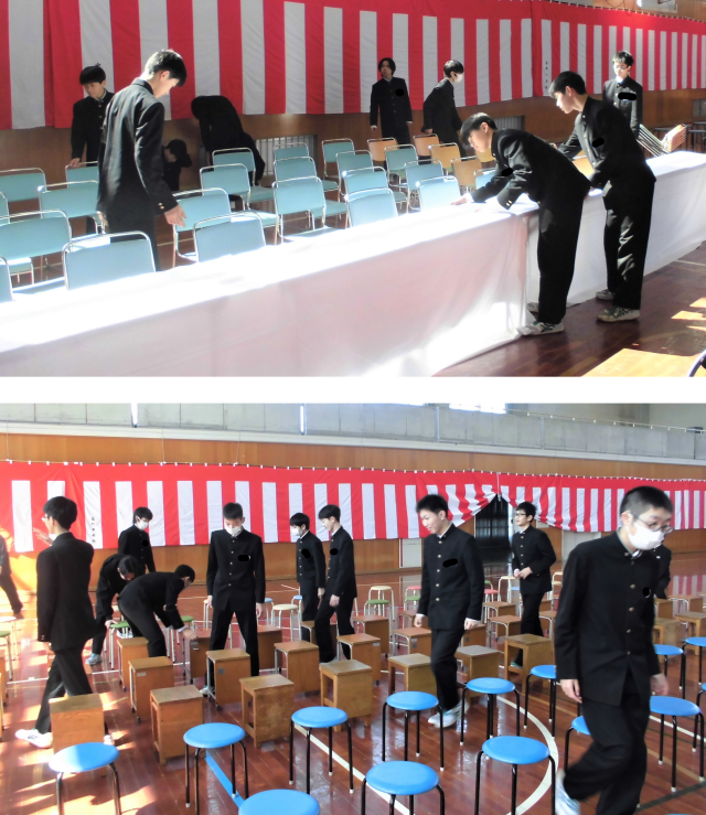 予餞会終了後、1.2年生は卒業式の準備、清掃活動を行いました。一生懸命に自分の役割を果たしている生徒たちです。