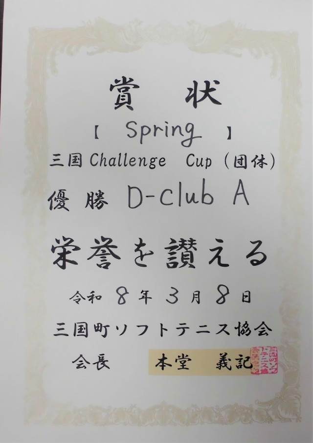 受賞報告です。地域クラブ 「D-Club」 Aチーム(男子ソフトテニス部)として出場した「三国Challenge Cup」  団体で優勝しました。今後も頑張ってください!