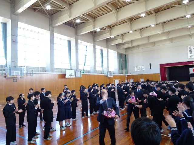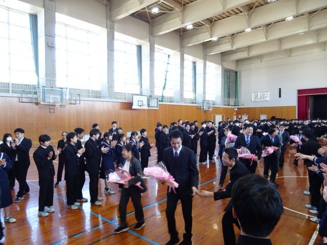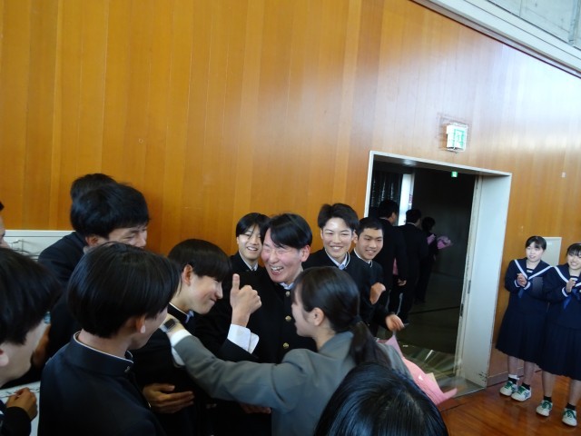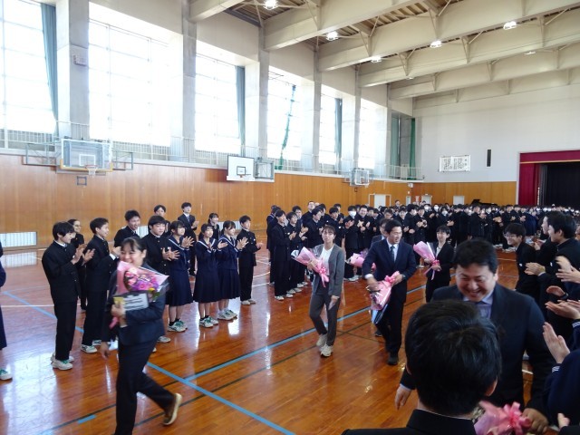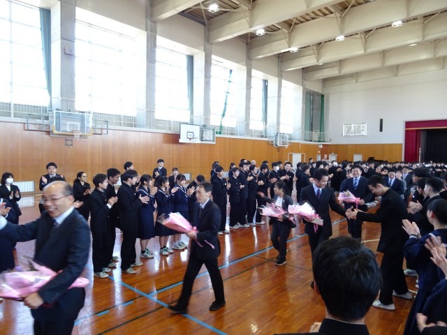 花道を作って、拍手で見送りをする生徒たち。卒業生もたくさん集まってくれました。