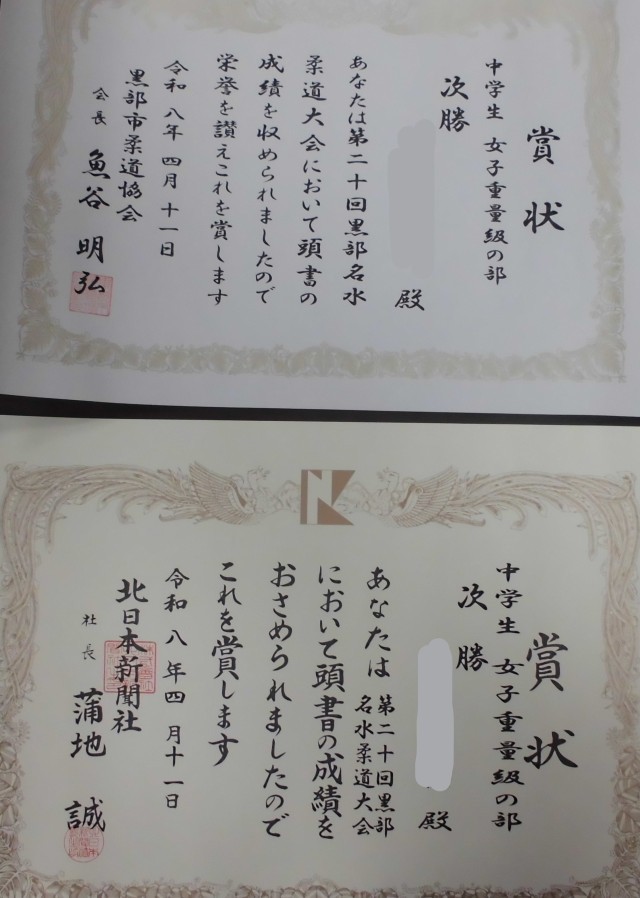 受賞報告です。柔道の地域クラブ(庄川クラブ)に所属している生徒が、第20回黒部名水柔道大会女子の部で次勝、富山県春季相撲選手権大会で2位と総合3位を受賞しました。本人は、柔道がメインなので、黒部名水大会の受賞が嬉しかったそうです。これからも頑張ってください。