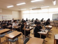 3年生の英語科です。「みらい中学の生徒の希望に合う弁当を提案しよう」という言語活動で学習を進めています。写真の場面は、課題にあるような弁当を英語で考えてる場面です。