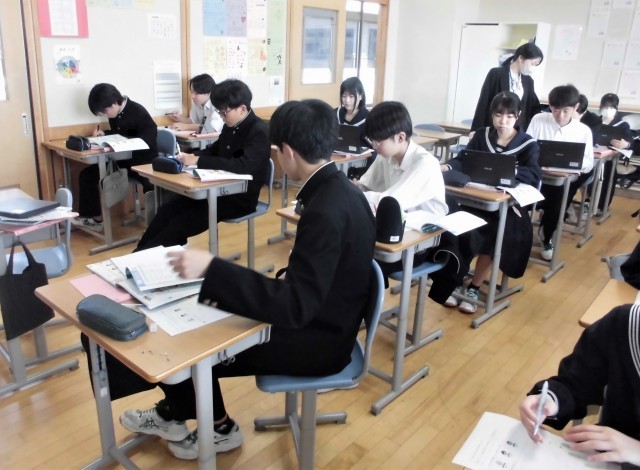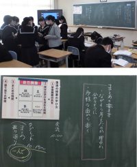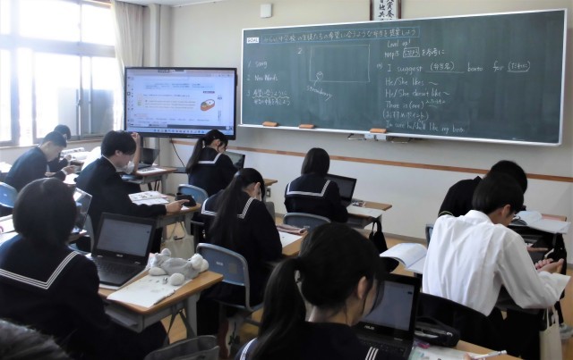 3年生の英語科です。「みらい中学の生徒の希望に合う弁当を提案しよう」という言語活動で学習を進めています。写真の場面は、課題にあるような弁当を英語で考えてる場面です。