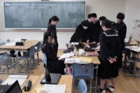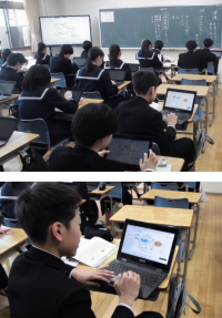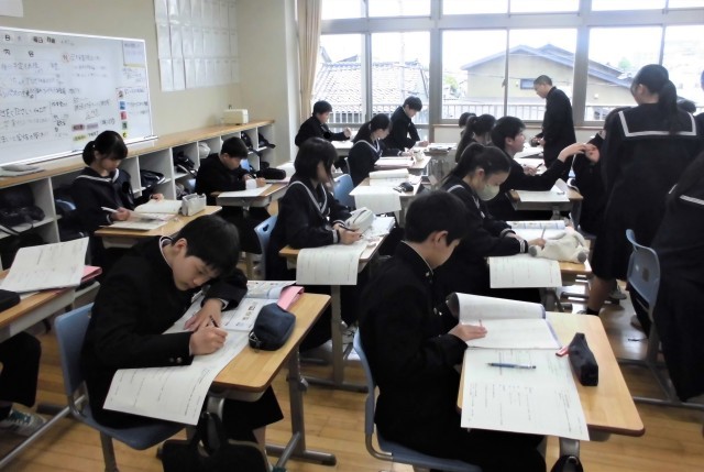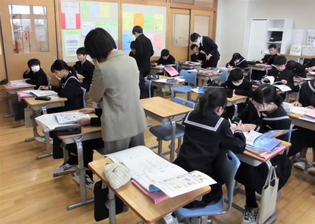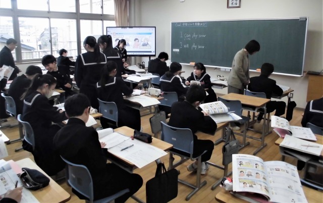 2年生の英語科です。「予定について表現しよう」という課題で学習を進めました。写真は、教科書の本文について、ワークシートに記入している場面です。生徒は真剣に学習に取り組んでいます。