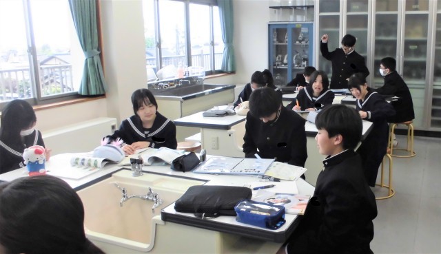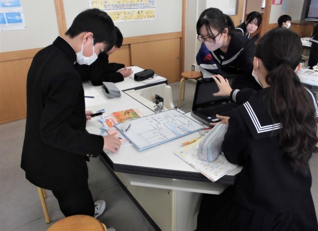 1年生の理科です。「生物の仲間分けを考えよう」を課題として学習を進めました。写真は、各グループで、生物の特徴を踏まえて話し合いながら、グループ分けをしている場面です。