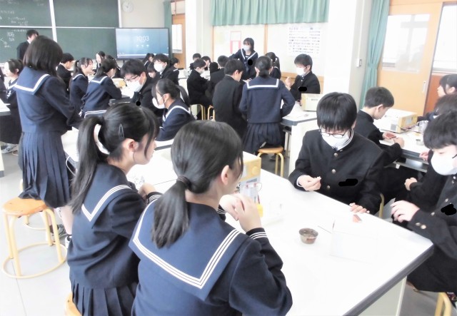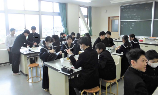2年生の理科です。「水を電気分解したときの変化を調べよう」という課題で学習を進めました。写真は、水を電気分解している場面です。班員で協力しながら実験をしています。