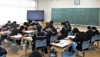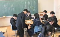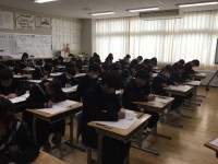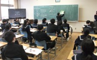 最初の2枚の写真は、1年生の英語の授業です。英語の授業では、「英語ですごろくをしよう」というテーマで、好きな教科・動物・食べ物などグループ内で英語で対話を行い、リアクションをするという言語活動を通して学んでいました。後の2枚の写真は数学の授業の様子です。数学科では、「絶対値を理解しよう」という学習課題のもと、学習問題に取り組み、自分の考えを伝えあっています。
