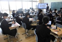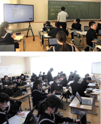1年生の社会科の授業では、「略地図をマスターしよう!」という課題のもと、ノートに世界地図の略地図を記入し、世界の概要について学習しました。疑問に感じたり、上手く地図を描いたりするため、友達や先生と情報交換している生徒たちです。