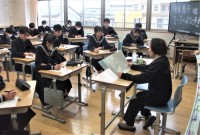 2年生の国語科の説明文のまとめの授業です。この説明文は、図表を用いてクマゼミの増加を取り上げ、環境について考えるものとなっています。本日の授業では、この文章のまとめとして、「分かりやすく説明するための筆者の工夫を見つけよう」という課題で学習しました。生徒は、自分で気付いた工夫点をタブレット端末に打ち込み、友達と考えを共有しました。