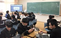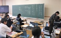 1年生の理科の授業では、「白い粉を見分けよう」という学習課題のもと、塩、砂糖、片栗粉、クエン酸、重曹などを、溶け方や観察実験などにより、類別する授業でした。生徒は、友達と相談しながら、理由を添えて分類しました。