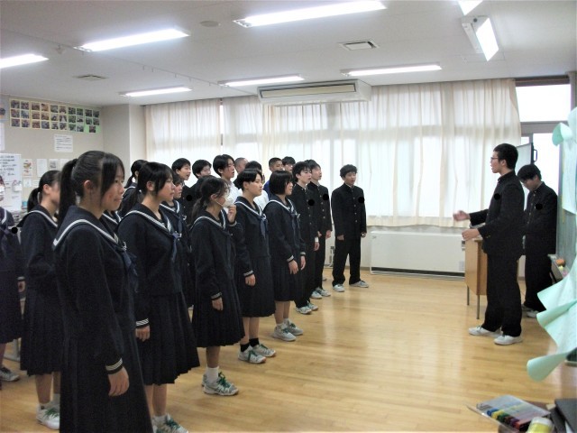 3年生の合唱コンクールリハーサルの様子です。文化会館での本番を見据えて、出入りの練習を行いました。3年生のどの学級も一生懸命、魂を込めて歌っていました。