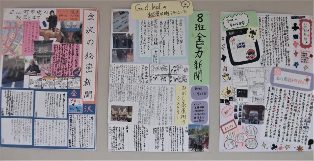 掲示物の紹介です。2年生の金沢校外学習のまとめ新聞です。来年は京都の班別学習です。