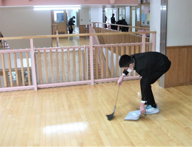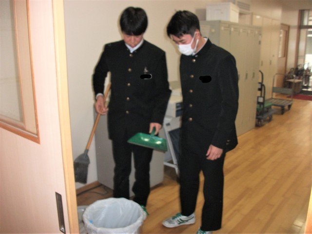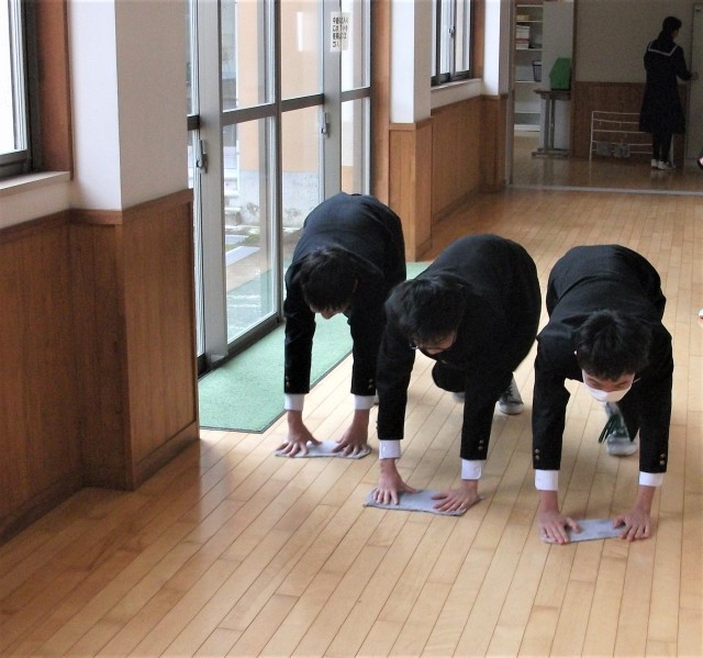清掃の時間の様子です。雑巾で水拭きが基本の清掃スタイルです。今日は午後から保護者会です。学校をきれいにしている生徒たちです。
