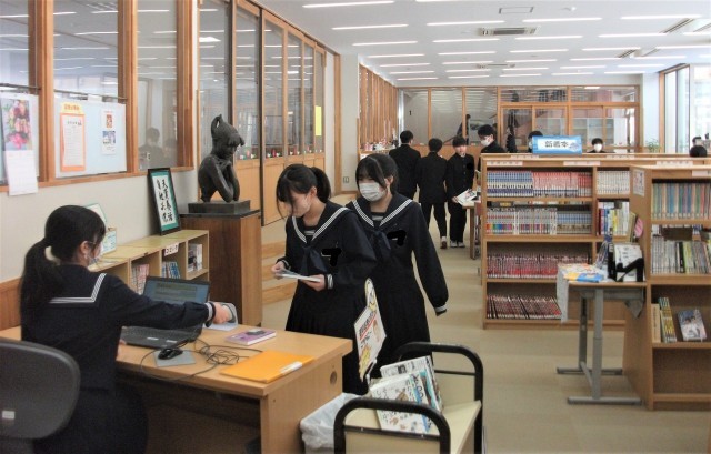 お昼の図書室です。大勢の生徒がくつろいでいました。本を読んだり、友達と談笑したり。生徒の興味・関心を高める工夫がしてある図書室は、生徒にとってくつろげる場所となっています!