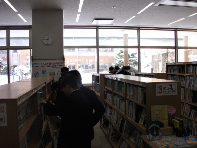中庭の雪景色が見える図書室の様子です。特設の「図書委員会企画『ブックジビンゴ』コーナー」にも生徒が来ていました。楽しい企画ですね。憩いの場所となっている図書室です。