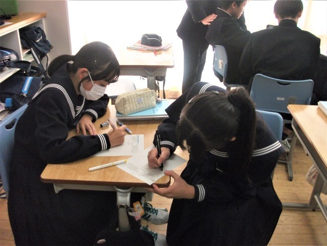 1年生の国語科の授業では、「目的・相手を明確にして、分かりやすい案内文を書こう」という課題で学習を進めていました。10月31日、11月1日に開催する和鐘文化祭の案内文を家族に対して作成するという言語活動を通して、案内文の書き方について学んでいます。生徒は友達と相談しながら、作成していました。