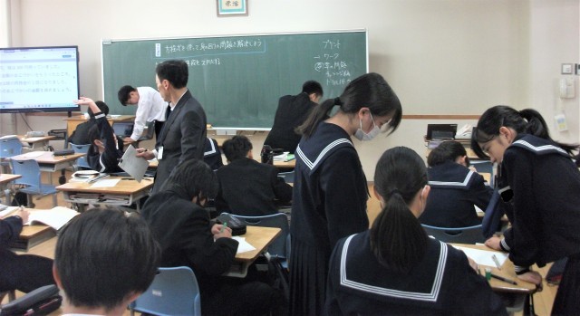 1年生の数学科の授業では、学習問題に挑戦!ということで、ワークや教科書の問題を、みんなで学び合い、教え合いながら学習を進めていました。黒板を使って問題を解いている生徒もいました。集中して学習に取り組んでいます。