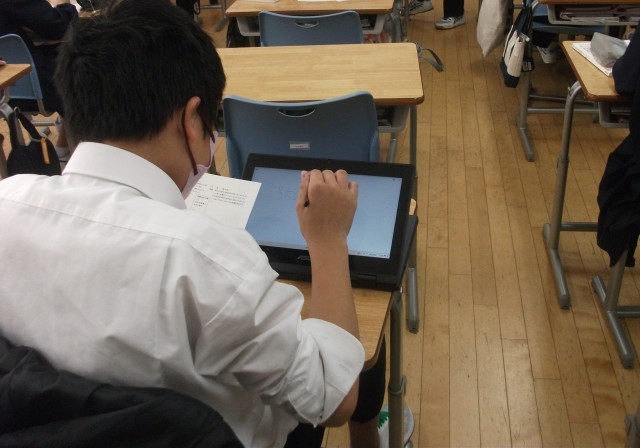 1年生の数学科の授業では、データの活用単元で、「○○を使ってA年度のデータを整理・分析しよう」という課題で学習を進めています。写真は、2学級の数学の授業です。データを整理・処理している生徒たちです。
