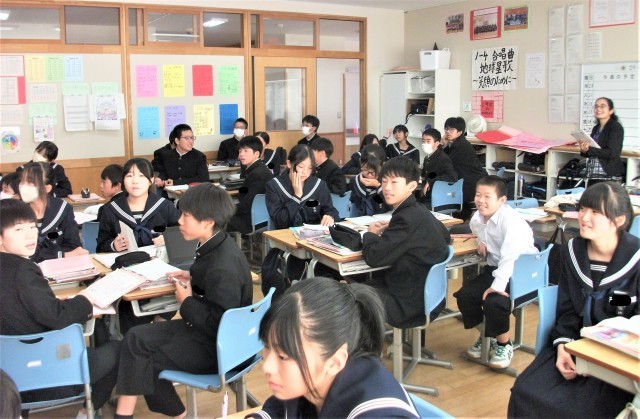 1年生の社会科の授業では、「時差はどのように求めればよいか」という学習課題で、標準時子午線(日本は東経135度)を基準として、時差について計算しました。生徒が黒板の前で、自分の考えを発表しています。真剣に話を聞いている生徒たちです。