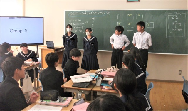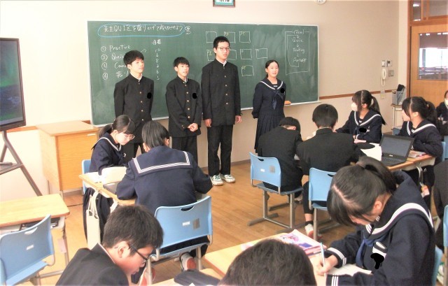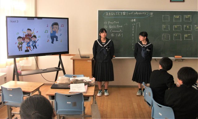 1年生の英語科の授業です。各グループで、「先生に関するクイズ」を作成してきました。今日は、いよいよ先生クイズを各グループが発表し、どの先生か当てるという時間でした。質問タイムもあり、大変盛り上がりました。